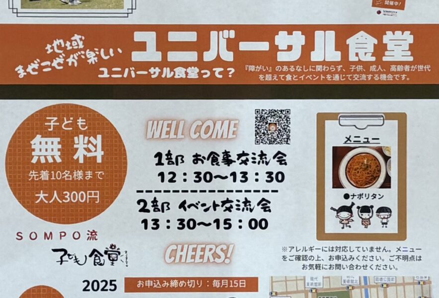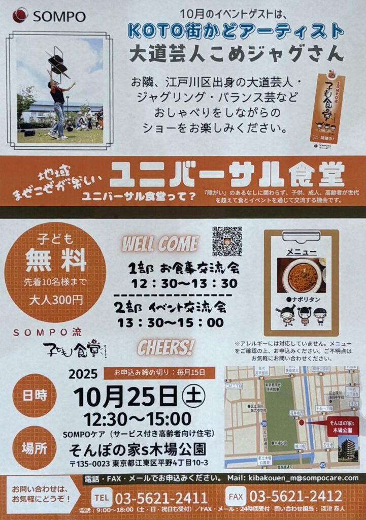 障害があってもなくても、幼児から高齢者まで誰でも大歓迎「ユニバーサル食堂」が毎月第四土曜日(次回10月25日)そんぽの家S木場公園(江東区平野4-10-3)で開催中。イベントは大道芸人・こめジャグさんによるショーです。