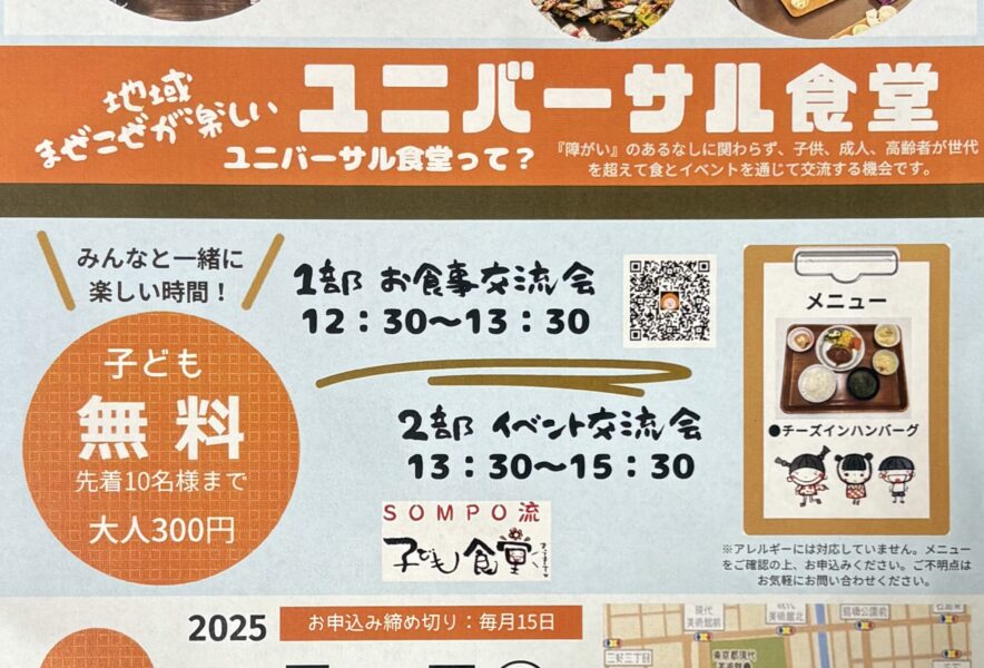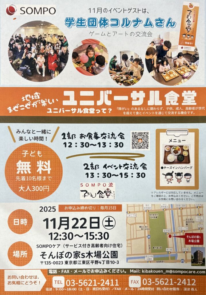 障害があってもなくても、幼児から高齢者まで誰でも大歓迎「ユニバーサル食堂」が毎月第四土曜日(次回11月22日)そんぽの家S木場公園(江東区平野4-10-3)で開催中。イベントは学生団体コルナムさんによるゲームとアートの交流会です。